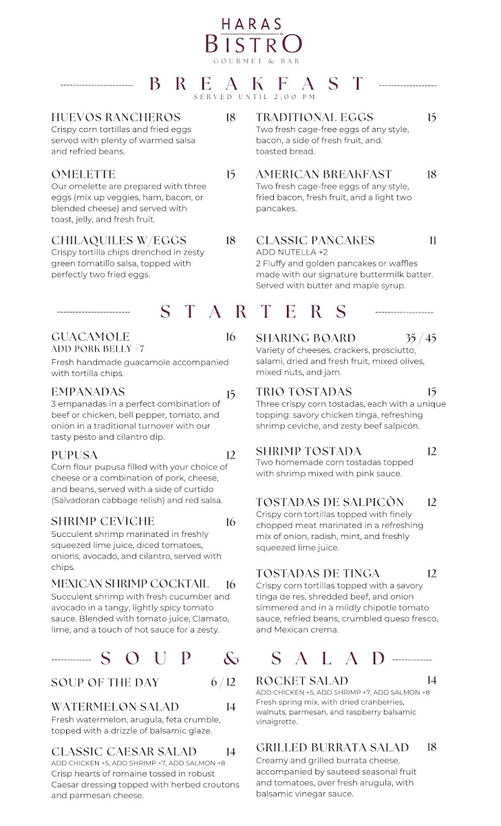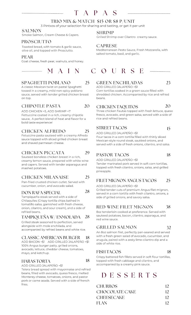 Welcome to Haras Restaurant, a hidden gem located in Magnolia, Texas, known for its delightful mix of flavors and inviting atmosphere. The menu features an array of vibrant salads like the Caprese Salad and the Vegan Quinoa Power Bowl, perfectly balancing freshness and health. Main courses, including the succulent Grilled Salmon and the exquisite Red Wine Filet Mignon, showcase culinary finesse that appeals to both hearty appetites and refined palates.